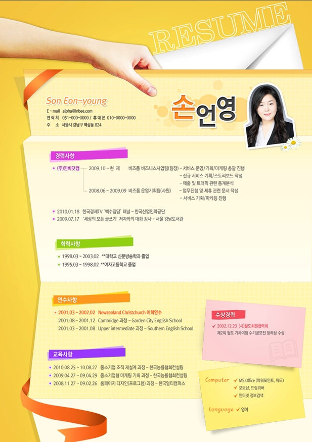 노란색 바탕의 배경으로 디자인 된 이색 디자인이력서입니다. 디자인이력서 샘플과 함께 디자인이력서에 본인의 이력사항을 기록할 수 있도록 구성되어있습니다.